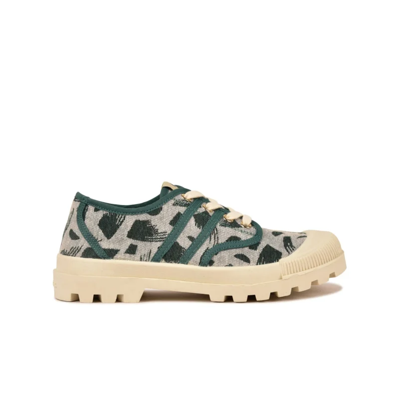Cette saison, l’Authentique Pataugas version basse se pare de motifs camouflages vert émeraude WALKIE TALKIE. Ce textile tissé en France avec des fils recyclés apporte un savoir-faire artisanal à cette chaussure femme. Sa semelle crantée légendaire est très souple et ultra-flexible. Cette chaussure en toile se déclinera parfaitement avec votre dressing estival.