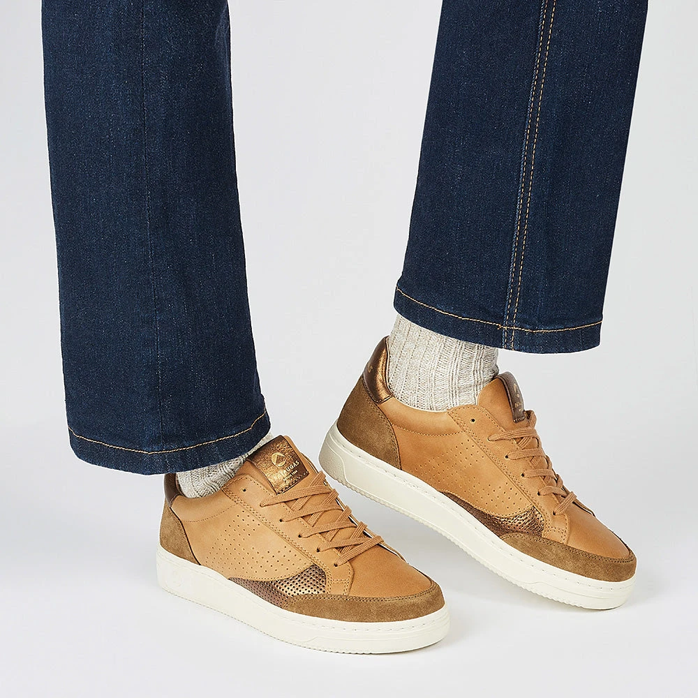 La sneaker pour femme BASALTE est revisitée cette saison avec une version féminine et épurée. C’est une basket pour femme munie d’une tige en cuir lisse mixée avec du cuir métallisé et de la suède. C’est une sneaker pour femme montée sur une semelle épaisse et très confortable. C’est la chaussure idéale pour allier confort et style.